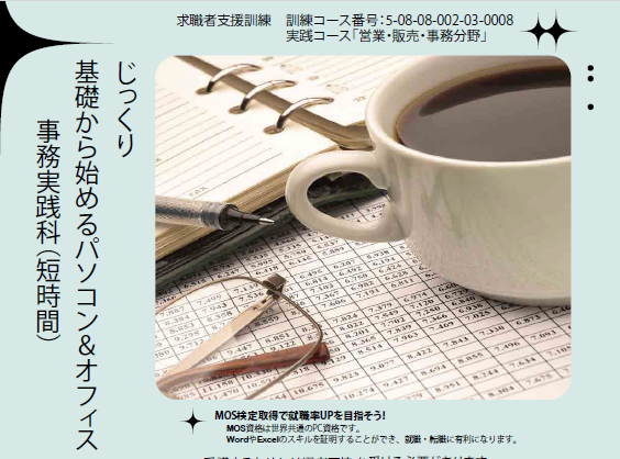 | 自己負担額 | テキスト代 13,420円(税込) USBメモリ 1,300円(税込) 駐車場代 3,000円(税込)(訓練全期間分) ※利用者のみ 任意受験の試験料 ※受験者のみ MOS Word / Excel2019 各12,980円(税込) コンピュータサービス技能評価試験ワープロ部門 3級 5,350円(税込) コンピュータサービス 技能評価試験表計算部門 3級 5,350円(税込) |